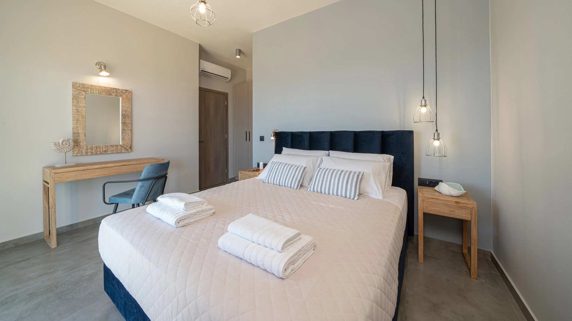 On the upper floor of the villa are two more spacious bedrooms. The first bedroom is a twin with an ensuite, Perspex panelled shower room. The second, the master bedroom, boasts a kingsize bed and ensuite shower room – all tastefully furnished with a blue/grey wood finish. Both upper bedrooms have clear panelled balconies, complete with table and chairs. Here you will be able to sit and relax high up and enjoy those stunning views. This Greek haven will have you rested and restored in no time.